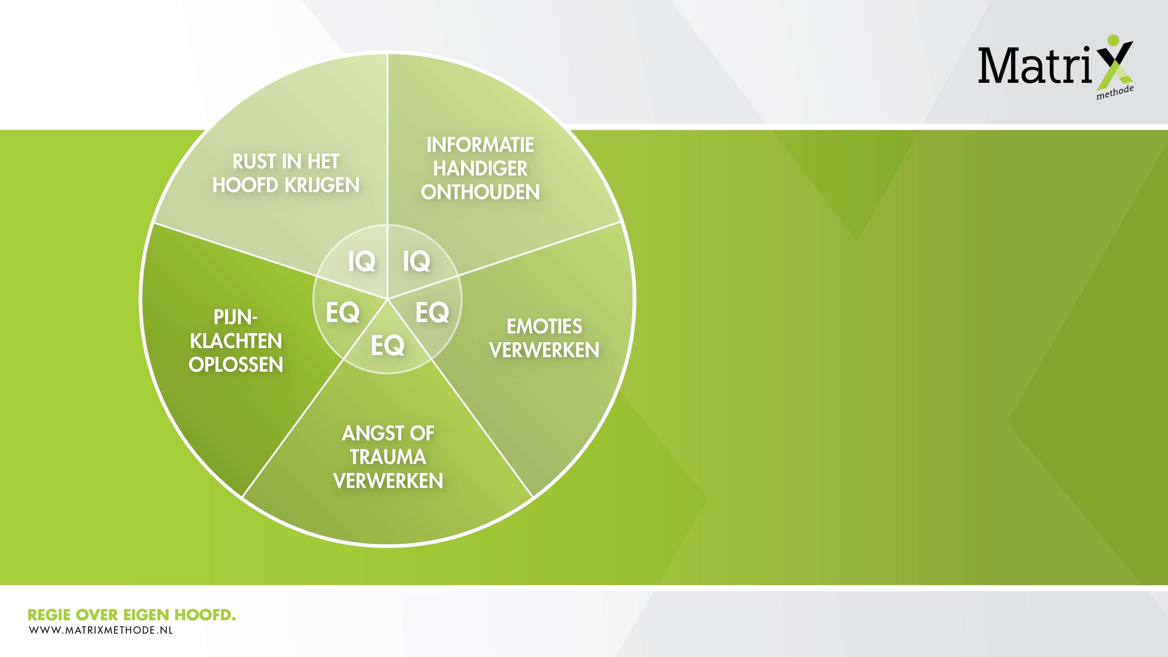 Door het stellen van gerichte MatriXvragen verandert de persoon zelf de zintuigelijke beleving die de hulpvraag veroorzaakt. De methode is onderverdeeld in IQ en EQ: